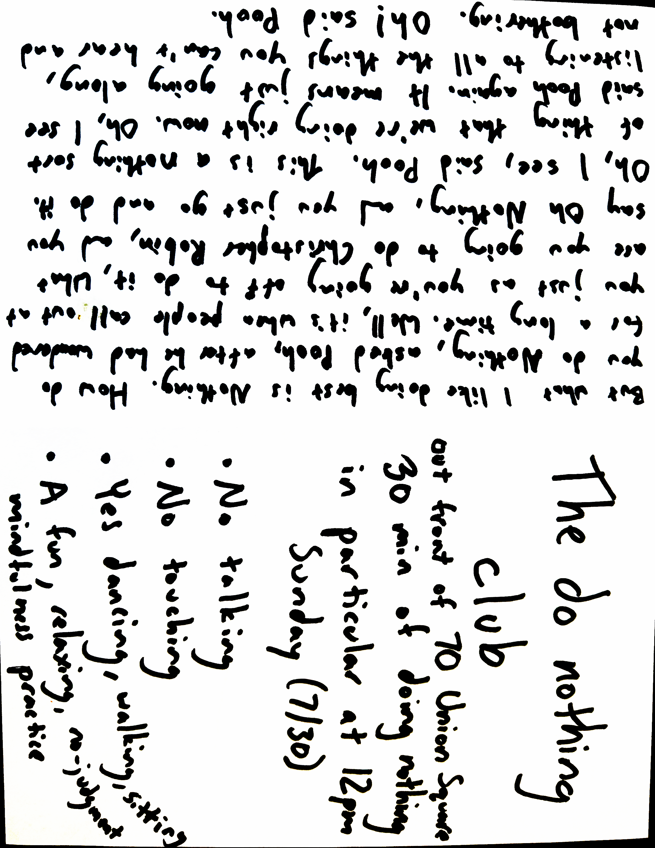 I ran my first-ever in-person club. It's called Do Nothing Club. I made this flyer for it and handed it out to random people on the street. 4 other people showed up!